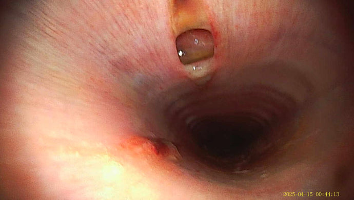 - et surtout une déchirure muqueuse visible en haut de l’image, signe possible d’irritation, traumatisme ou inflammation chronique.